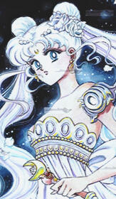 hair long hair styled in two buns with flowing pigtails (though her hair was a silvery-white color as opposed to Usagi's blonde), and a golden crescent moon on her forehead to mark her status as a member of the royal family of the Silver Millennium